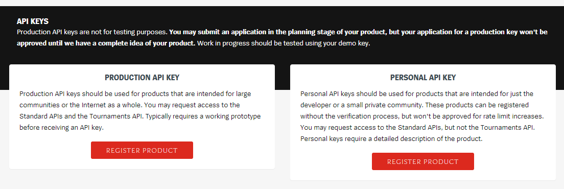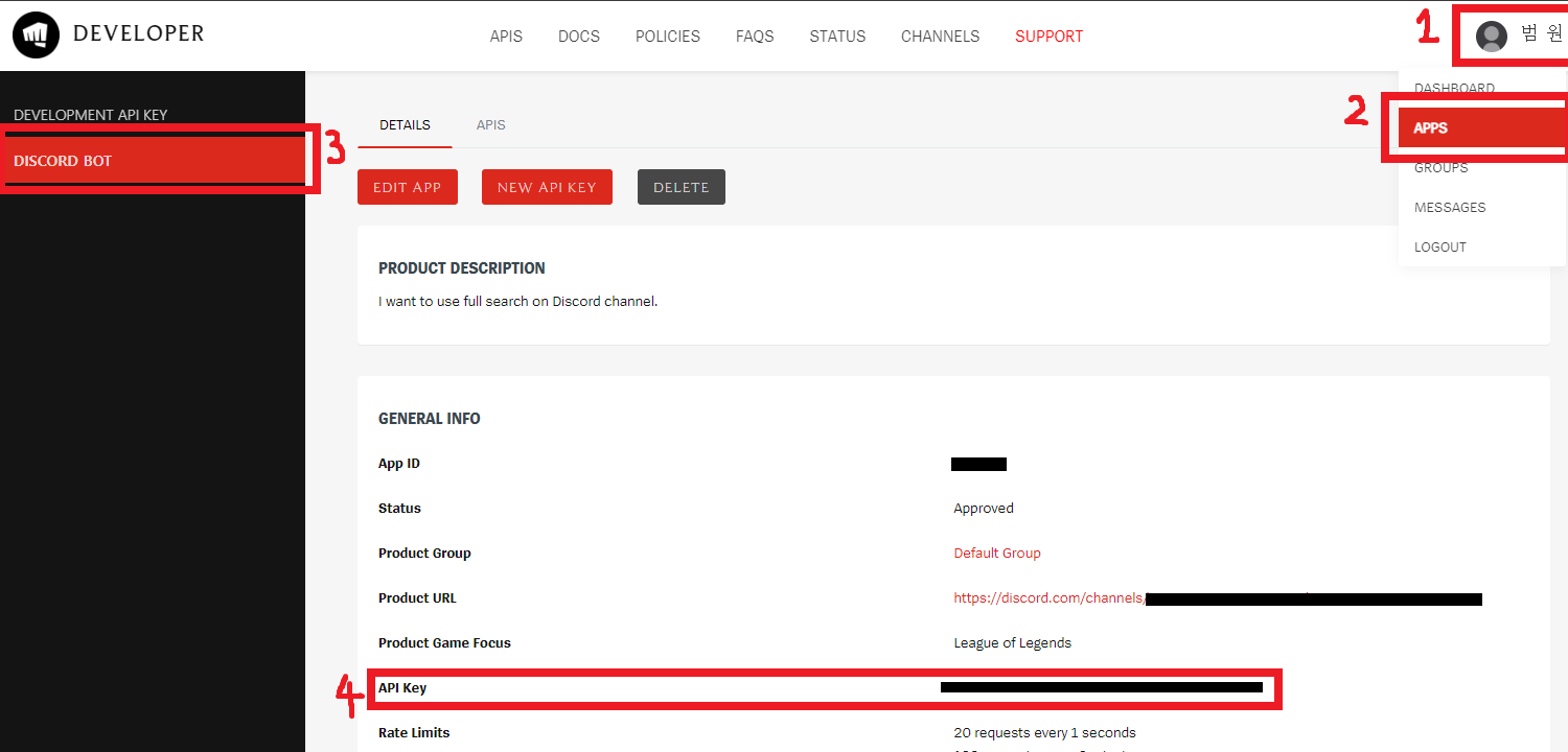 주말에 심심해서 전적검색 디스코드봇을 만들어 보기로 했다. 정보가 많이 없어서 일일히 라이엇파일을 뜯어보고 만들었다. 만들어보고 싶으면 천천히 따라해보면 좋을 듯 하다. 먼저 디스코드봇을 만들어야하고, 라이엇 api의 토큰을 받아야한다. riot api 토큰을 받기 위해 먼저 riot 개발자 페이지로 가서 토큰을 받아주었다.