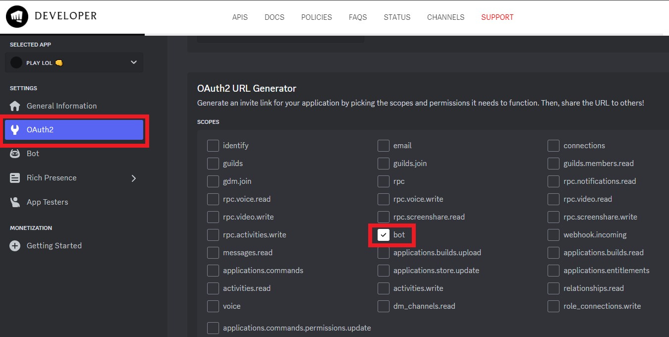 그리고 OAuth2를 누르고 bot에 체크표시를 해준다.