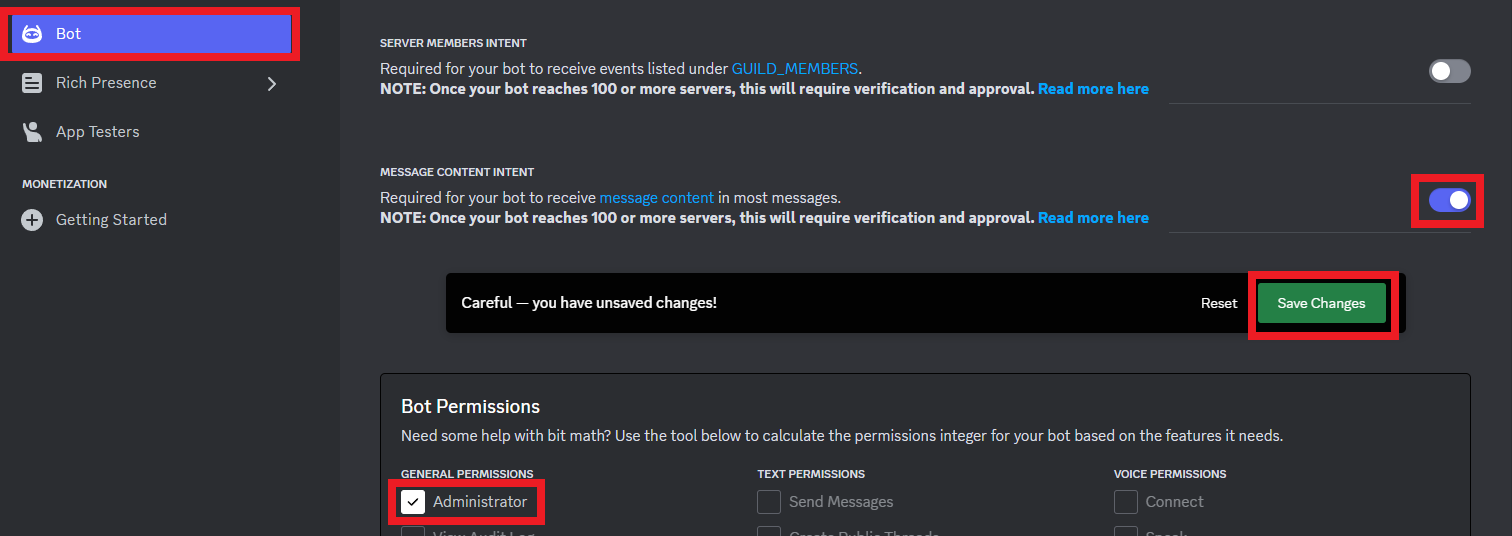 bot 버튼을 누르고 제일 아래 메시지 활성화버튼을 누르고 save changes를 누른다. 그리고 bot permissions 에서 administrator을 눌러준다.