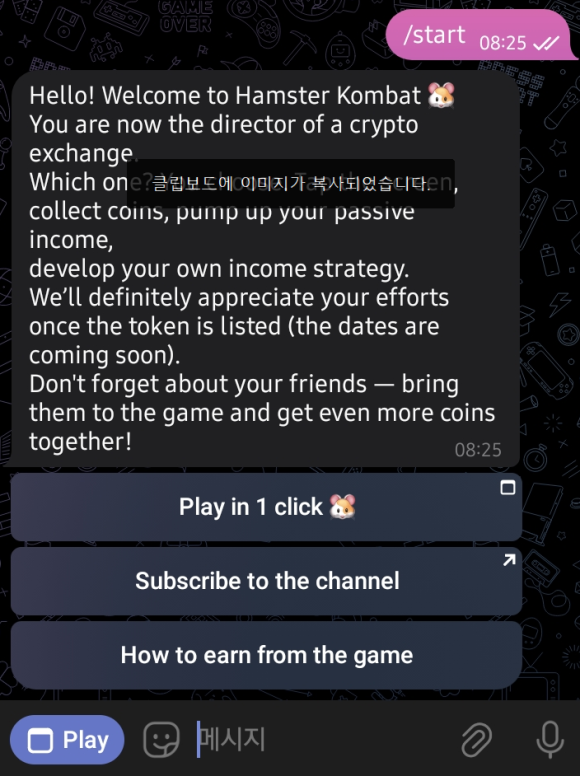 위 주소로 텔레그램에 들어가면 햄스터가 보이는데 햄스터를 클릭하면 포인트를 얻을 수 있어요.