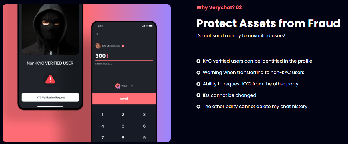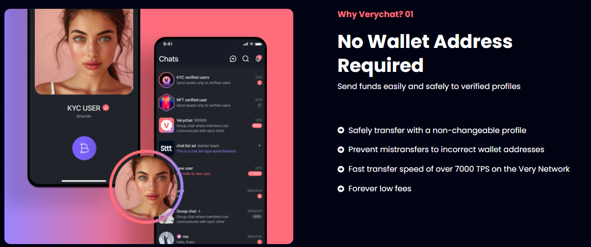 Verychat은 별도의 지갑 주소 없이 검증된 프로필 간에 안전하고 빠른 자산 전송이 가능합니다. 이를 통해 사용자는 디지털 자산을 손쉽게 관리하고 거래할 수 있습니다.