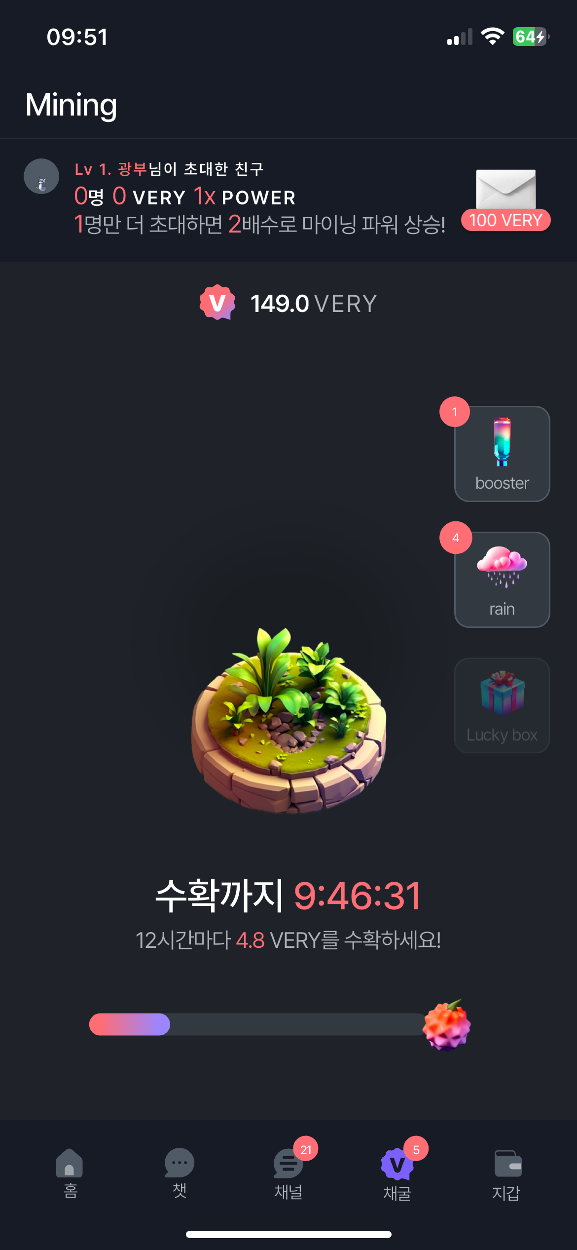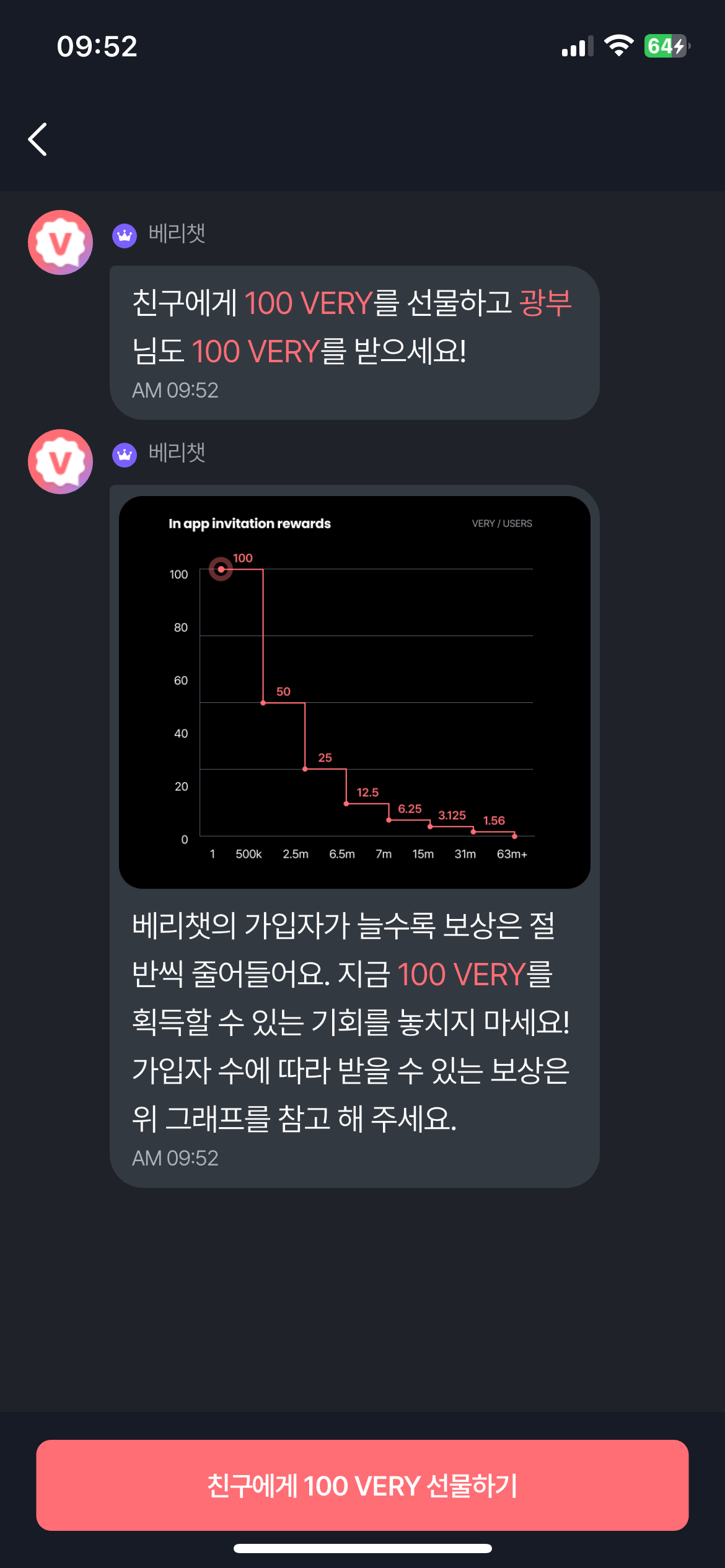 2. 친구를 초대하면 무료 채굴의 양이 증가함. 초대로 가입시 100very, 그냥 가입시 0으로 시작