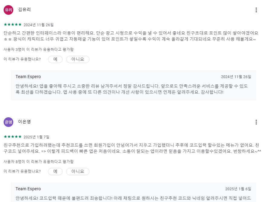 4. 유저피드백이 빨라서 오류가 나서 포인트를 못받거나, 문제가 있으면 바로바로 대처해줌