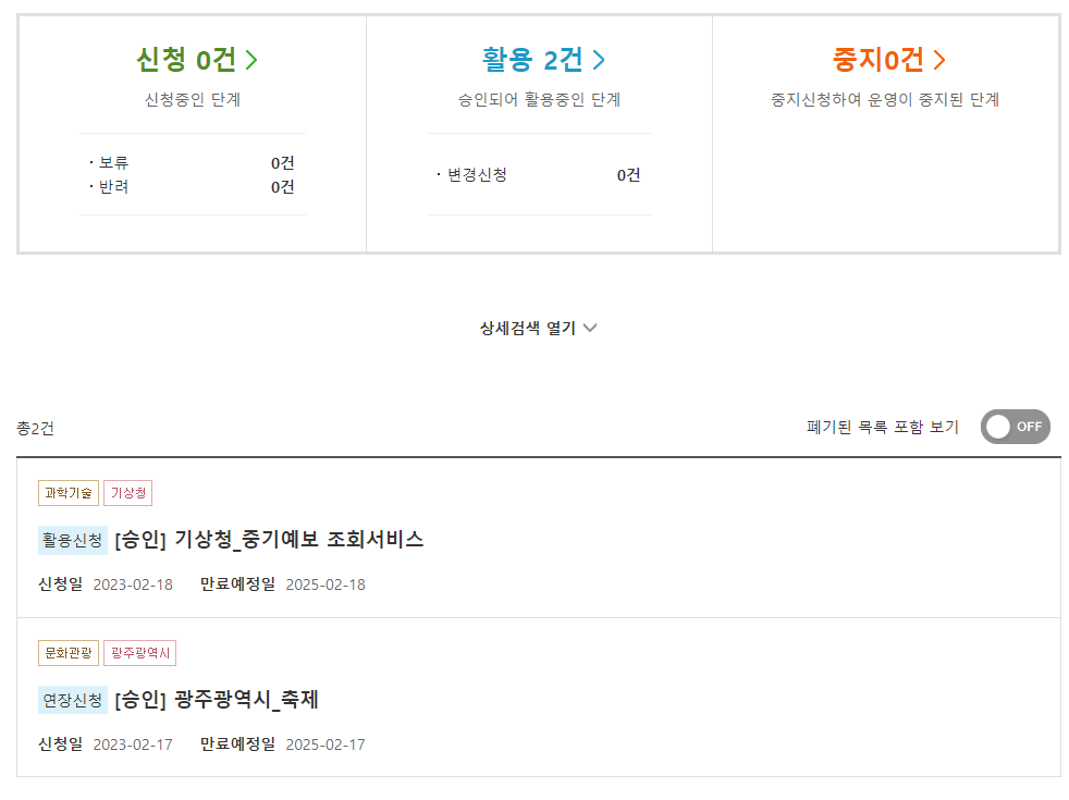 활용신청을 하고 [승인] 기상청_중기예보 조회서비스를 누르면 API 키를 얻을 수 있다.