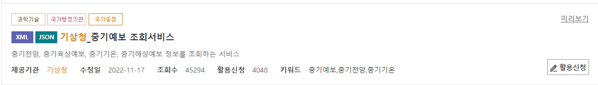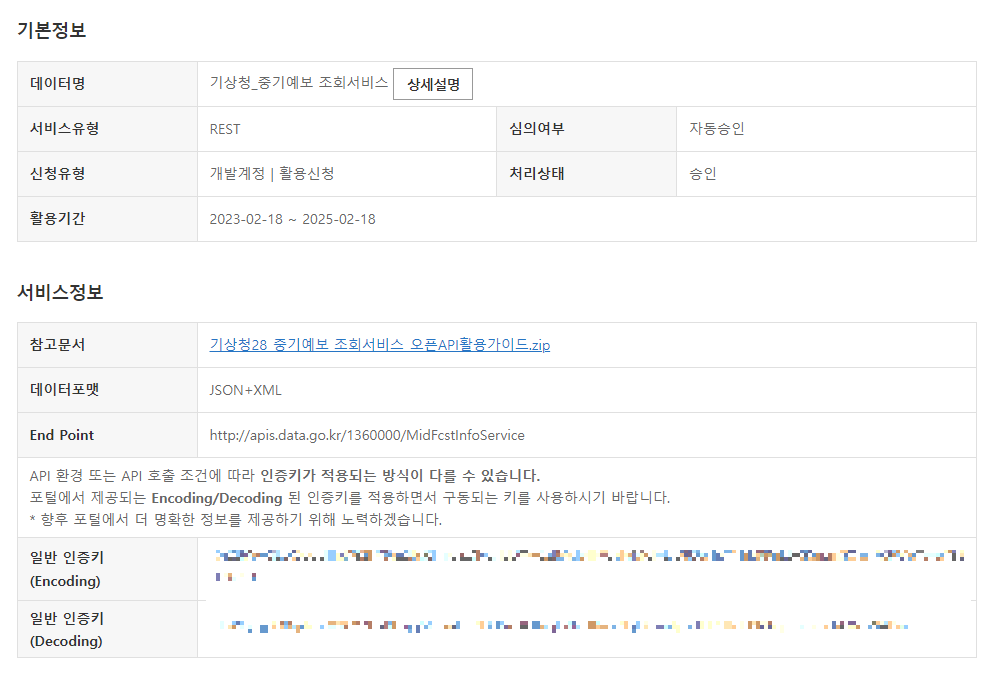 활용신청을 하고 [승인] 기상청_중기예보 조회서비스를 누르면 API 키를 얻을 수 있다.