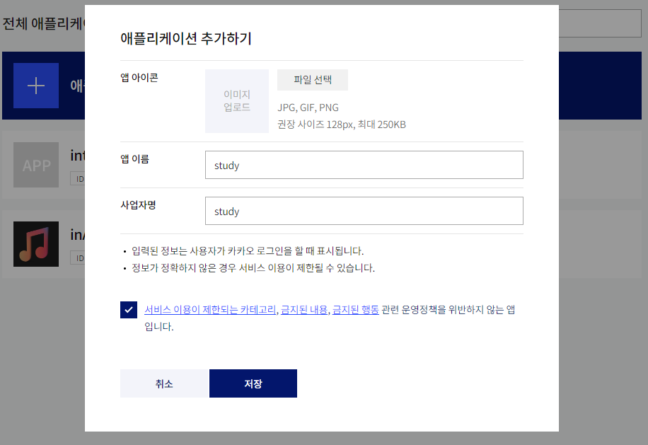앱 이름과 사업자명을 적어준다. 그냥 공부할 목적이면 애플리케이션이 어떤 용도로 쓰일지 적어주면 된다.