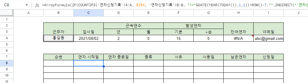 먼저 D4(입사일)이 적혀있으면 '연차신청기록'시트에서 근무자의 이메일을 찾는다.