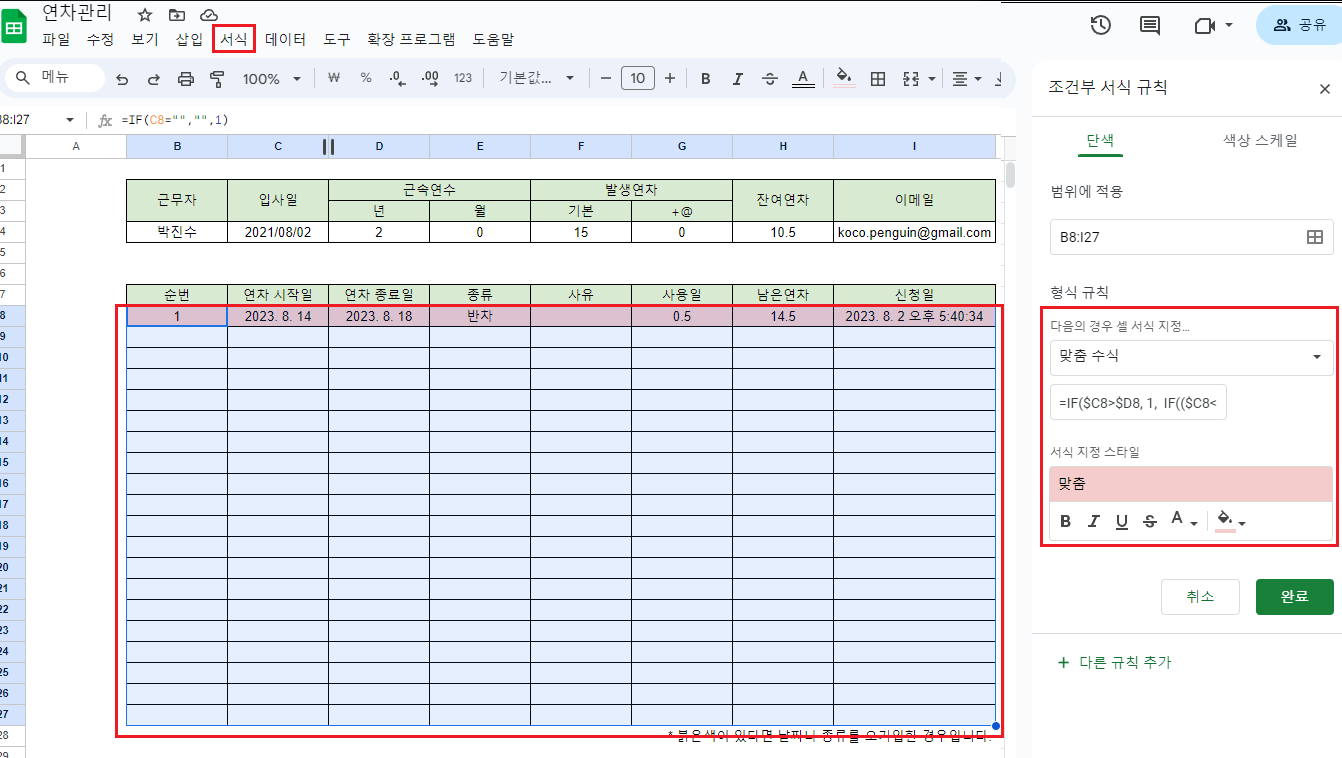 연차인데 반차로 잘못 쓰는 경우에는 그 행이 빨간색으로 바뀌게 된다.